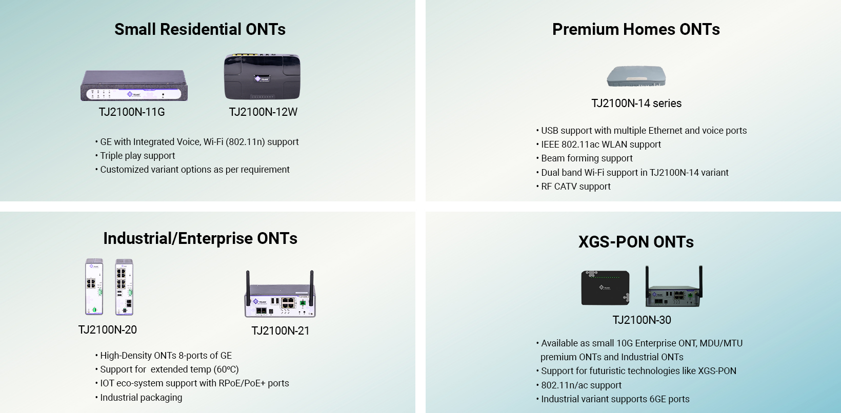 Tejas offers a series of advanced GPON /XGS-PON ONT elements designed for next-generation Optical Access networks deployed in FTTH (Fiber-to-the-Home) and FTTB (Fiber-to-the-Building) formats. It addresses the rapidly growing service provider needs for flexible, high-capacity fixed-line broadband solutions to support emerging high bandwidth video applications (e.g., IPTV, Mobile backhaul, MTU, VOD) in enterprise, residential deployments, aggregation of backhaul traffic from LTE cell sites, enterprise VPN Services and SD-WAN networks based on NFV paradigm.