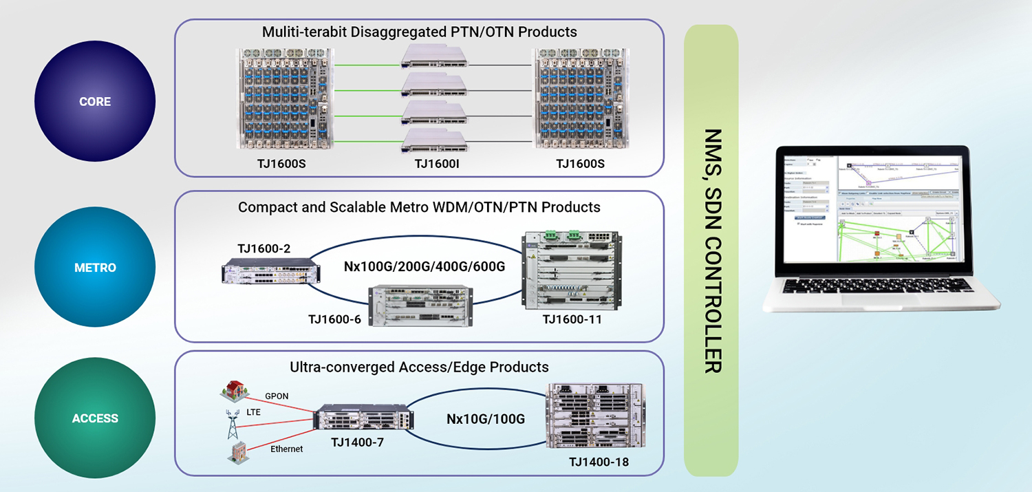 Tejas supports programmability and automation capabilities through it’s TJ5500 hybrid domain controller. This combines the programmability with integrated FCAPS for a multi-layer, multi-technology network. This supports full FCAPS from the GUI itself for provisioning end-to-end DWDM services, end-to-end OTN, MPLS-TP, SDH/SONET and GPON. It supports a standards based REST NBI interface for programmability of DWDM, OTN, PTN, SDH/SONET and GPON services.